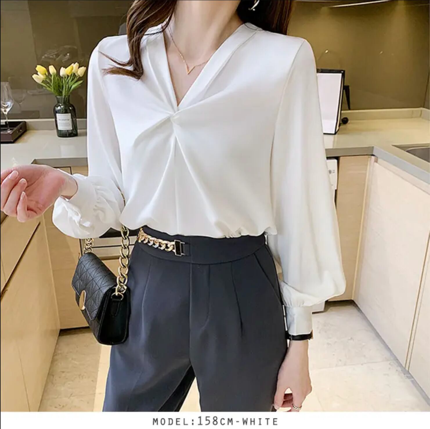 トップス シャツ ブラウス 長袖 バルーン Vネック タック サテン調 オフィスカジュアル フォーマル